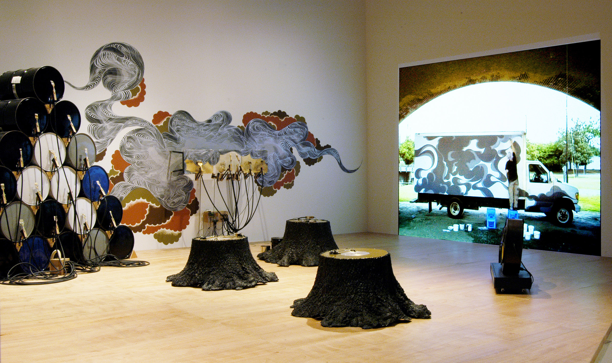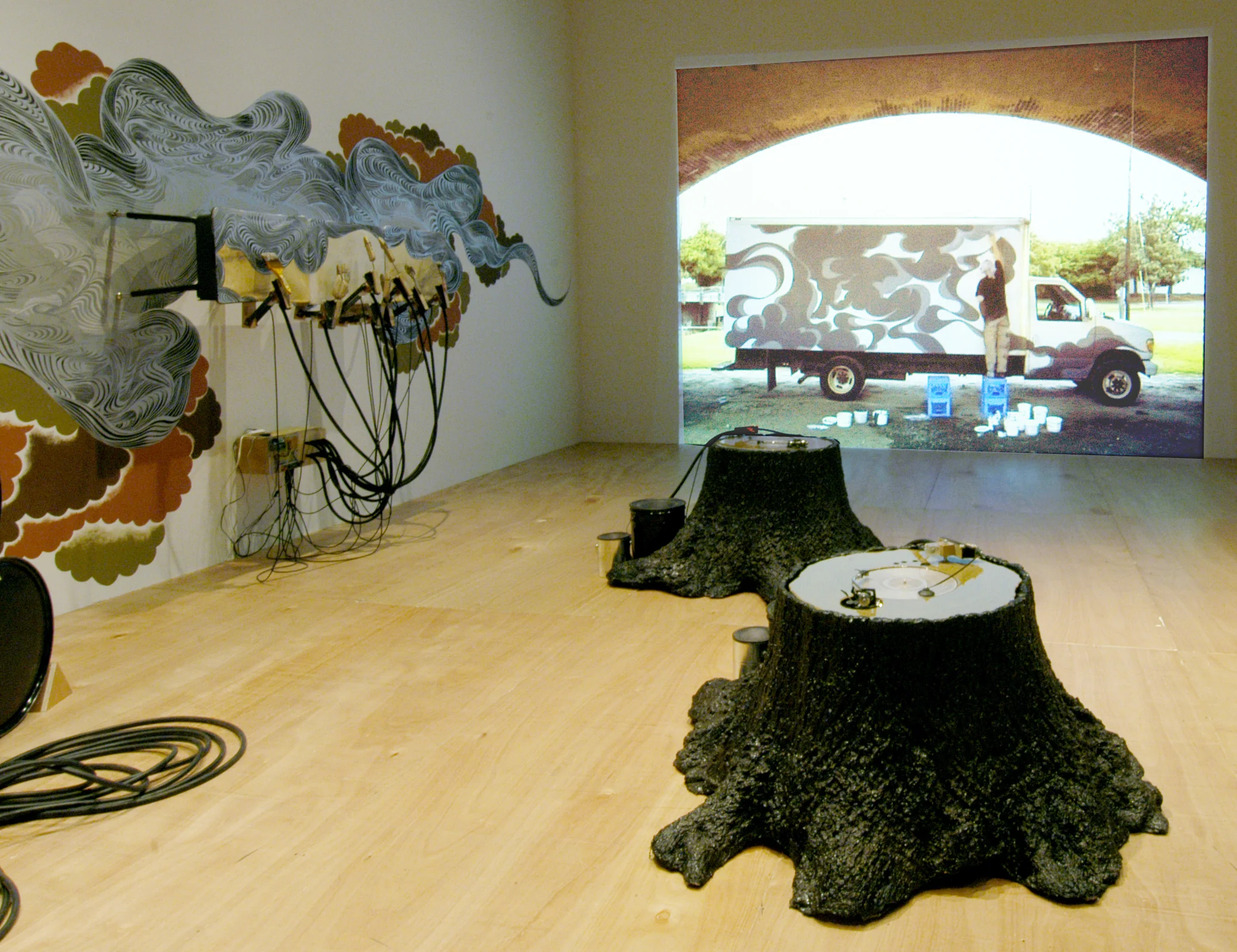 silver enamel, oil drums, school desks, latex paint, enamel, drum beaters, vacuum pumps, paint brushes, paint cans, paint roller, rubber tubing, goat skin, raw hide, wood, steel, amplifier, speakers, aqua resin, cast tree trunks, turntables, ipod, mac mini, Teleo boards, springs, double bass