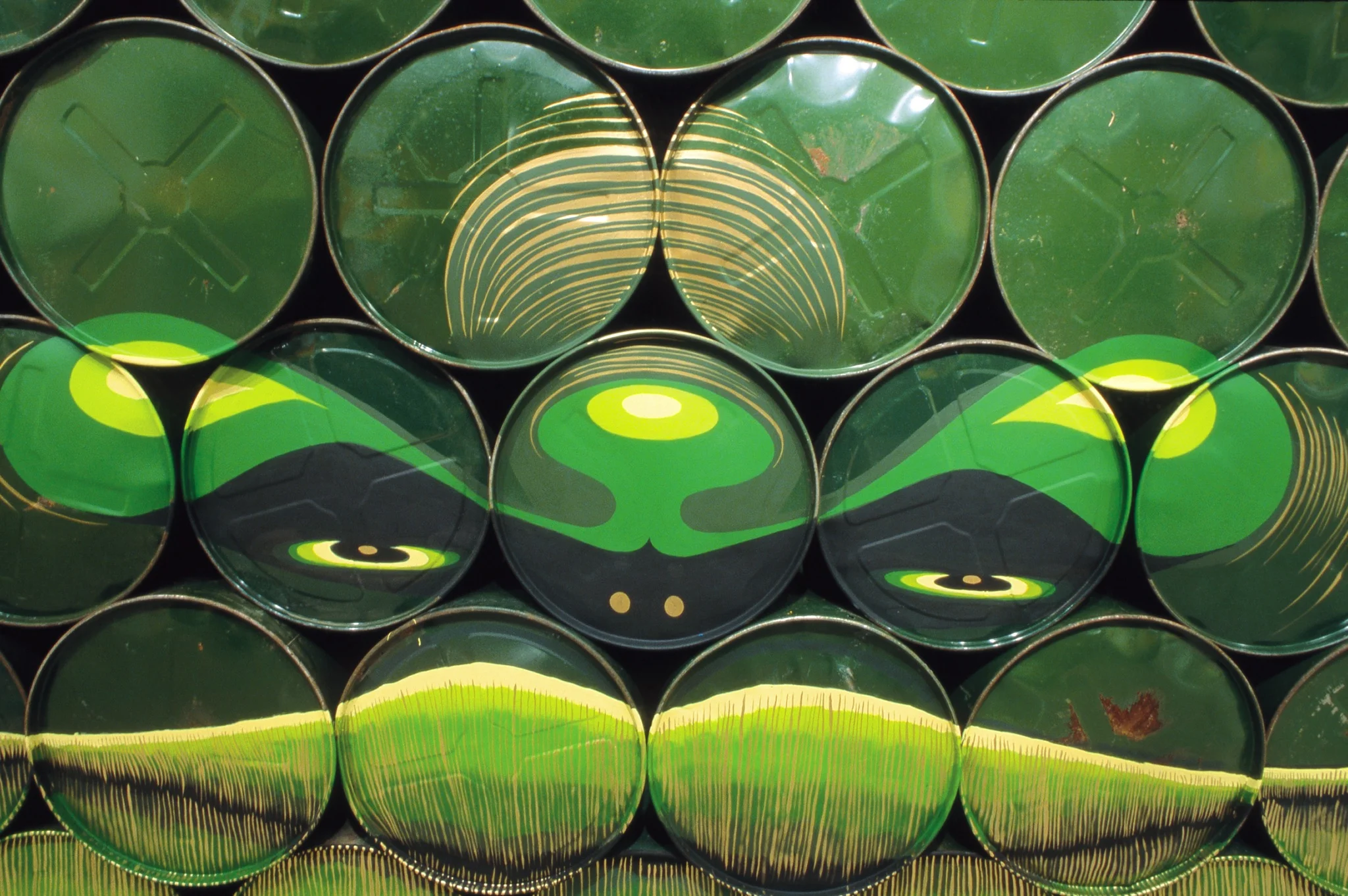 Conversation’s focus is the dialogue of two grouse, animalistic hybrids based on animals familiar to Ellis from his childhood. The grouses’ conversation adds to the installation’s sound, a driving and complex polyrhythmic composition produced by beaters pounding out beats on oil drums, paint cans, plastic buckets, and the grouse. A smoke-shaped cloud, in hues of fire-reds and cool greens, forms a grouse face on the oil drums, and then snakes around the gallery walls, finally pooling in the middle of the front glass. This tour de force painting picks up the beat and visually completes Ellis’s exuberant installation.